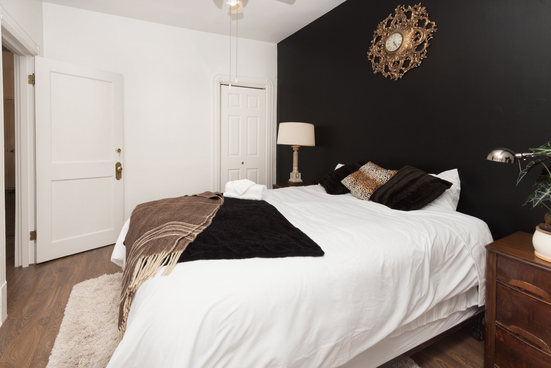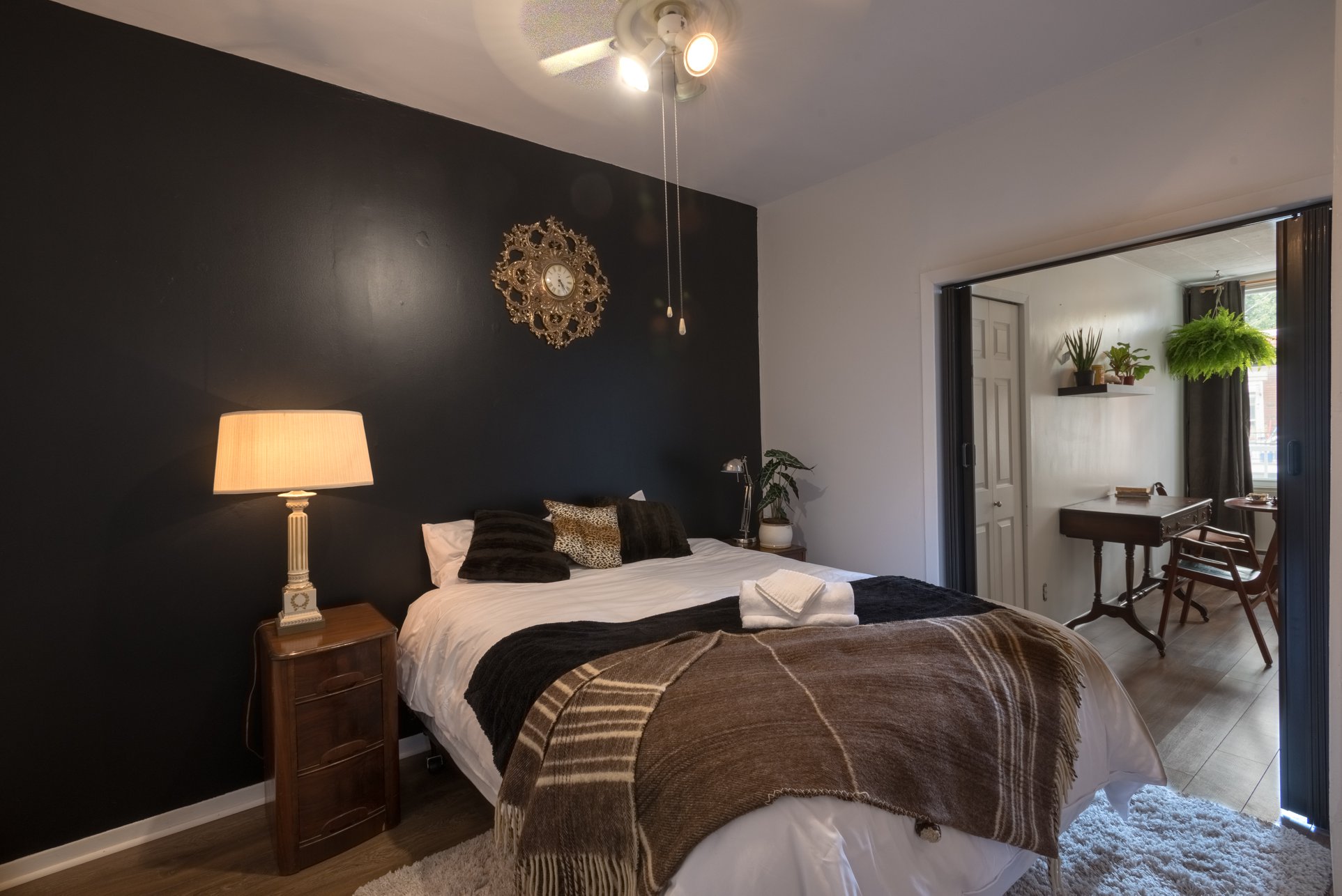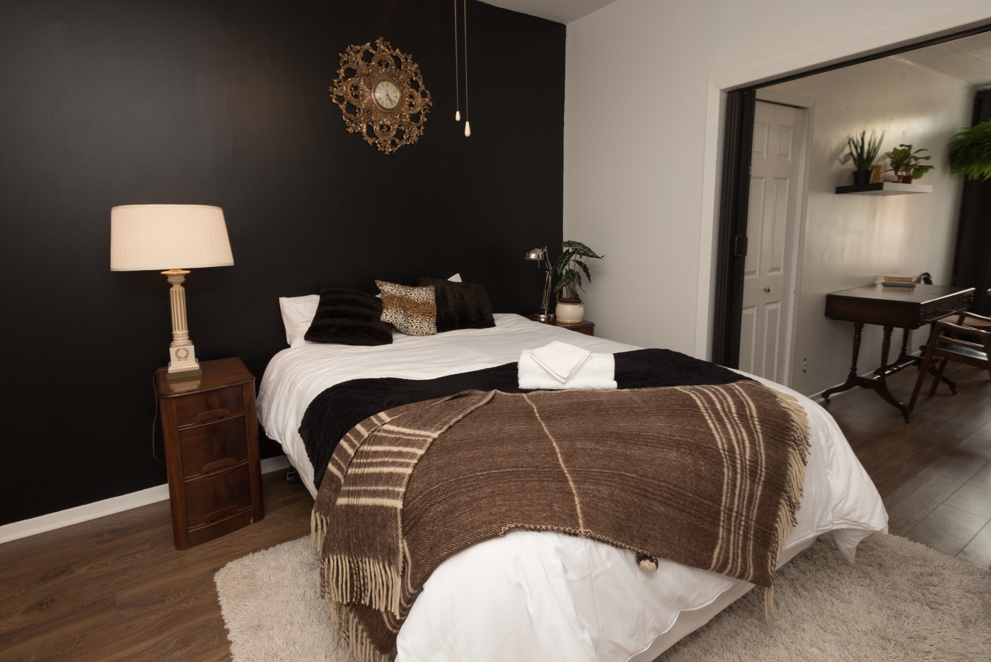 The master room has a queen size bed with 2 night tables with drawers, 2 lamps and a closet storage space with a pole to hang your clothes. A black painted wall is highlighted by a huge vintage ornate gold clock on top of the bed.